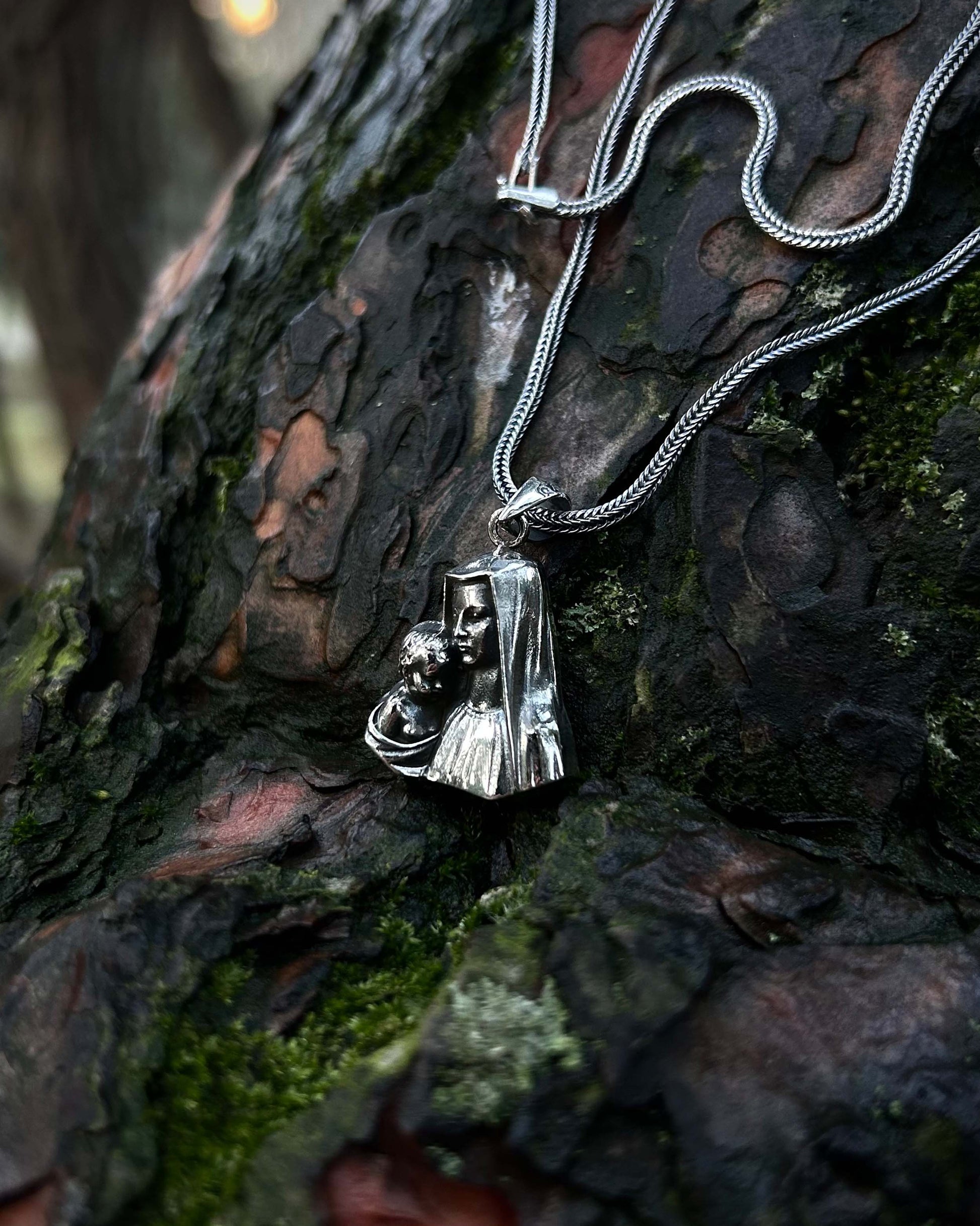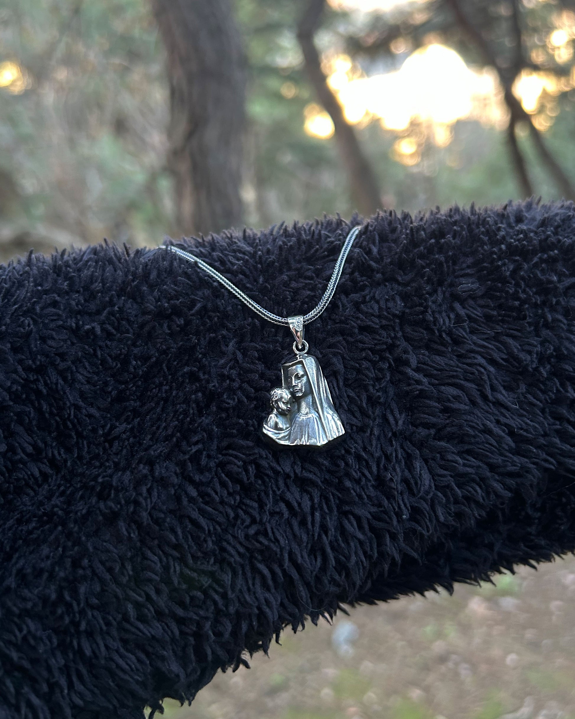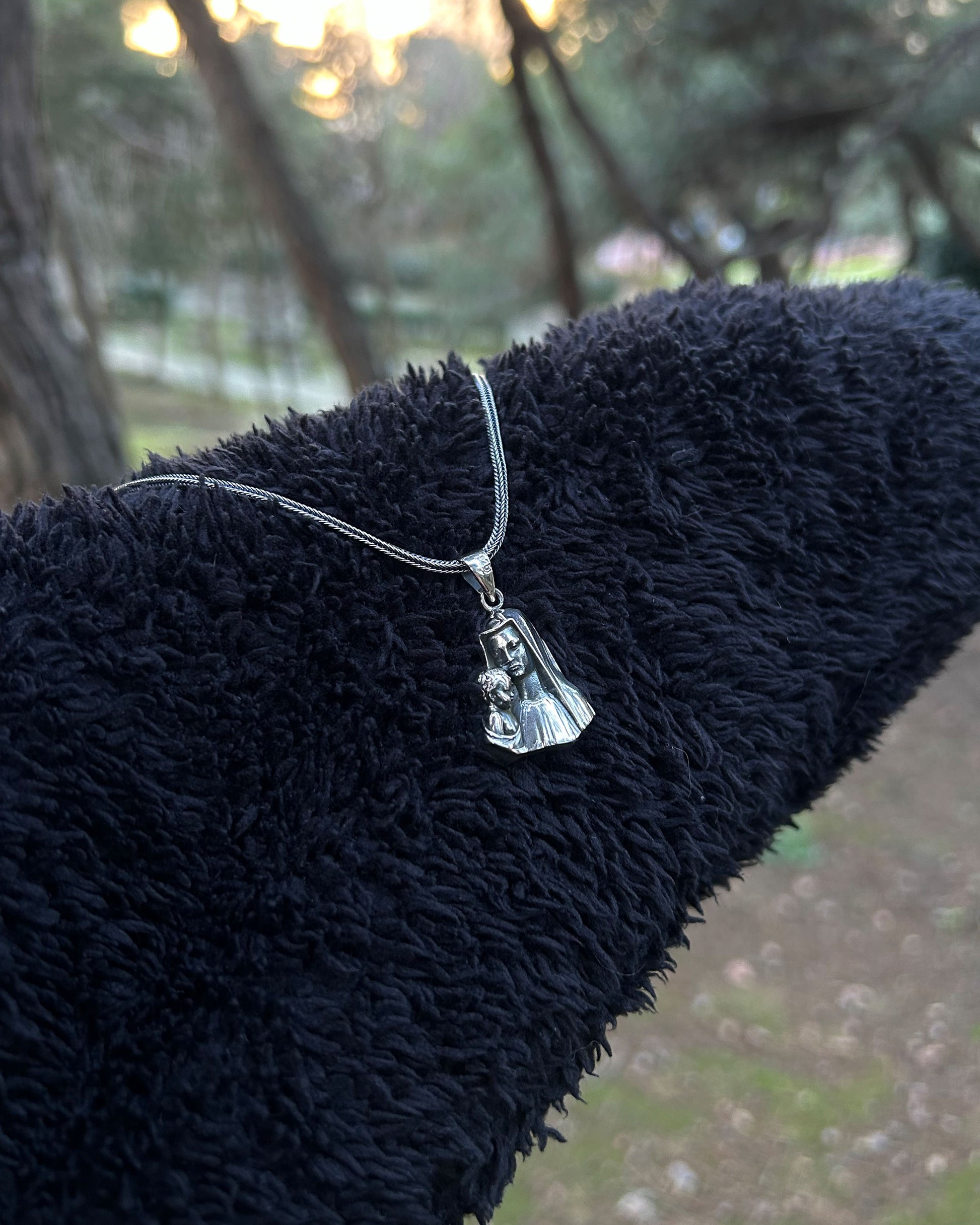 925 ayar gümüşten üretilmiş bu kolye ucu, Meryem Ana ve Hz. İsa figürlerini bir arada tasvir eder. Şefkat, koruma ve ilahi sevgi sembolizmini taşıyan bu tasarım, inanç temalı takılar arasında özel bir yere sahiptir.