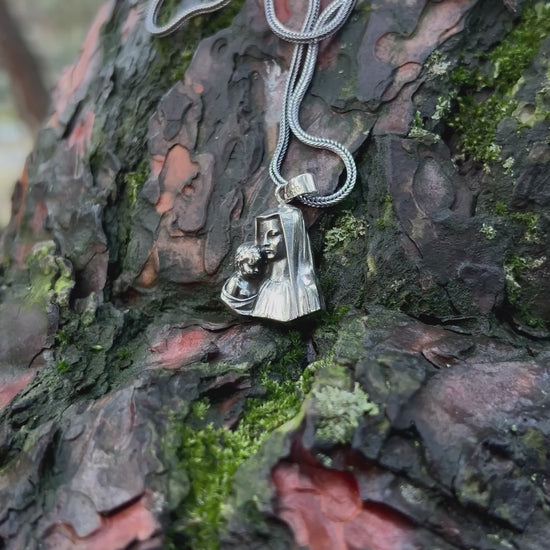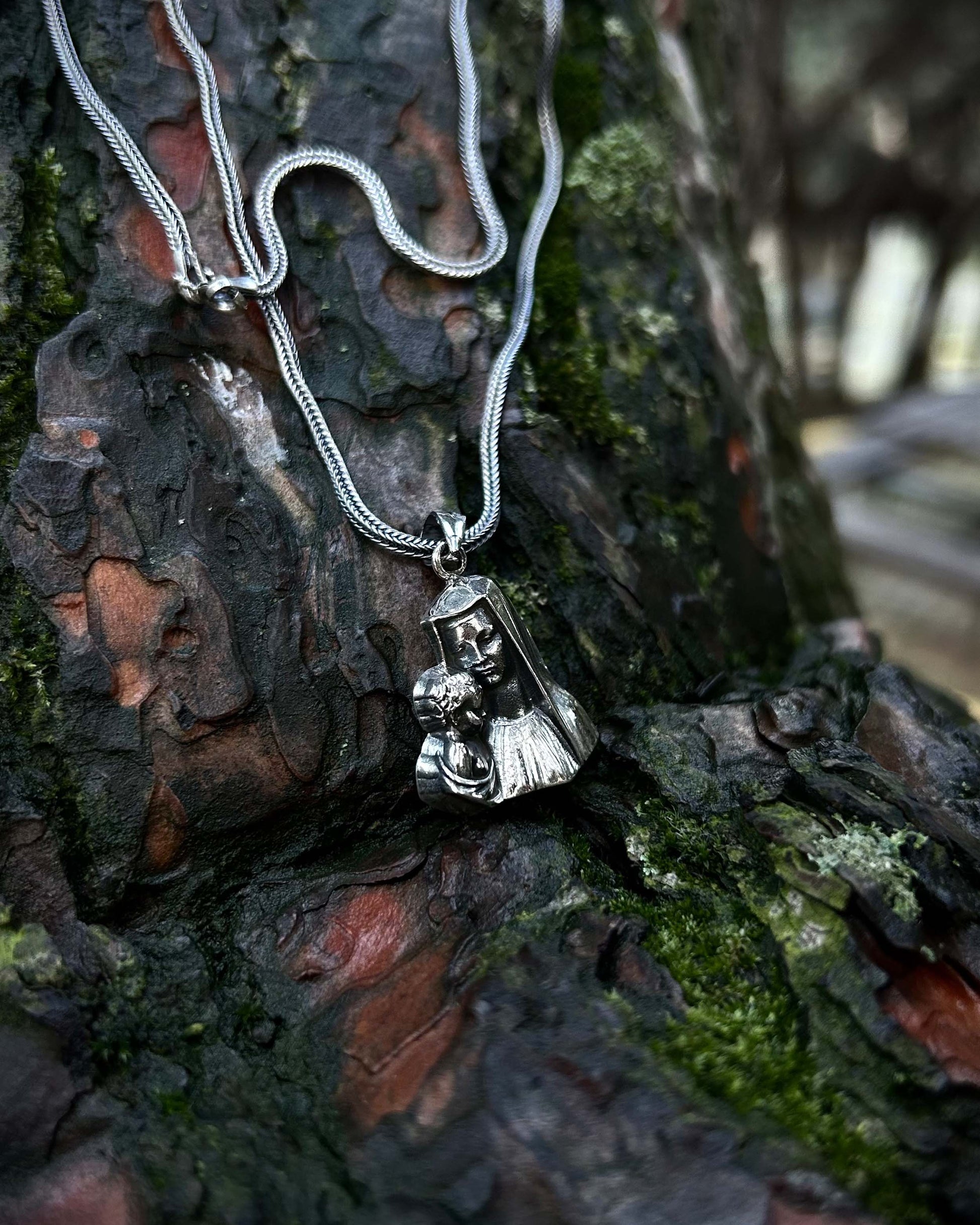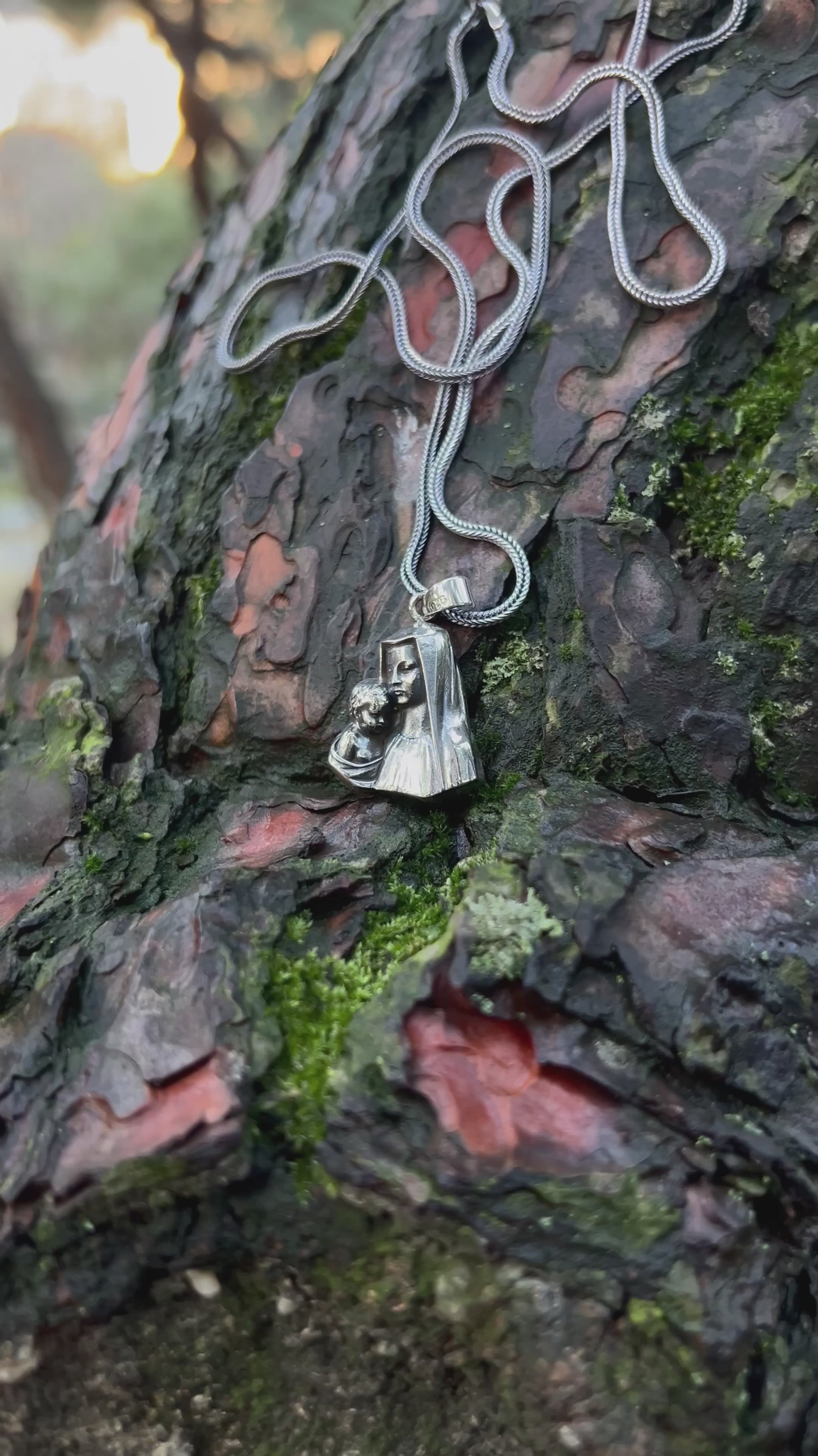 925 ayar gümüşten üretilmiş bu kolye ucu, Meryem Ana ve Hz. İsa figürlerini bir arada tasvir eder. Şefkat, koruma ve ilahi sevgi sembolizmini taşıyan bu tasarım, inanç temalı takılar arasında özel bir yere sahiptir.