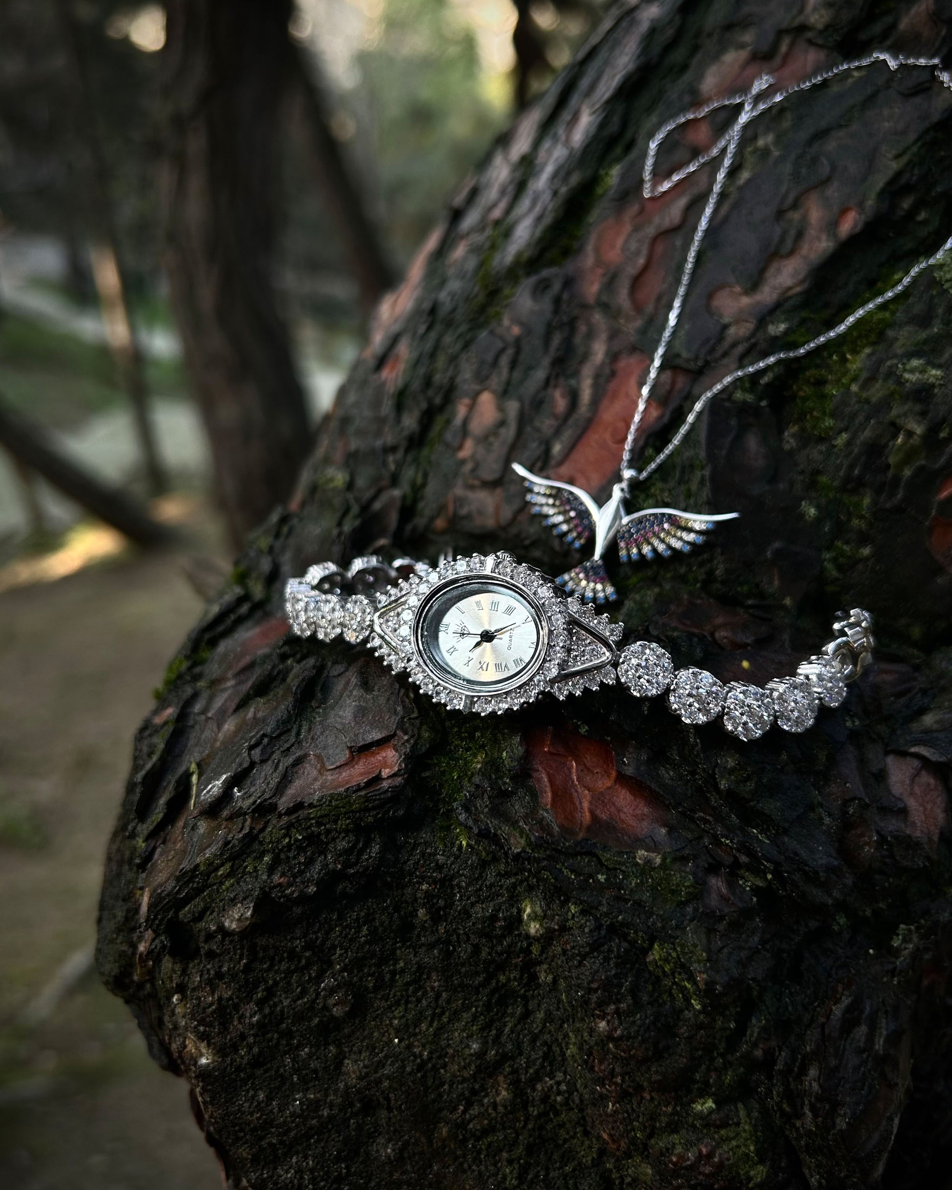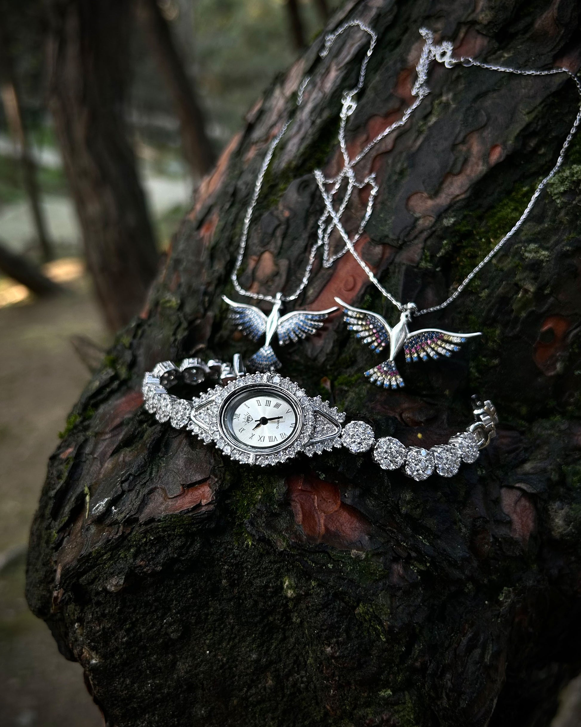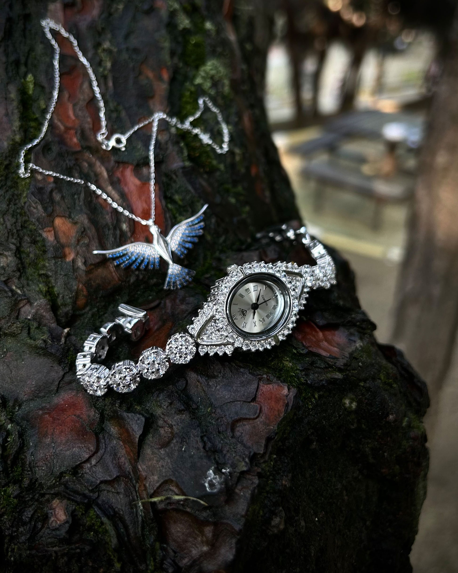 ▶ Bu saat, 925 ayar gümüşten üretilmiş ve yaklaşık 125–130 adet zirkon taşla elde süslenmiştir. Etsy üzeri satış fiyatı 20.490TL'dir