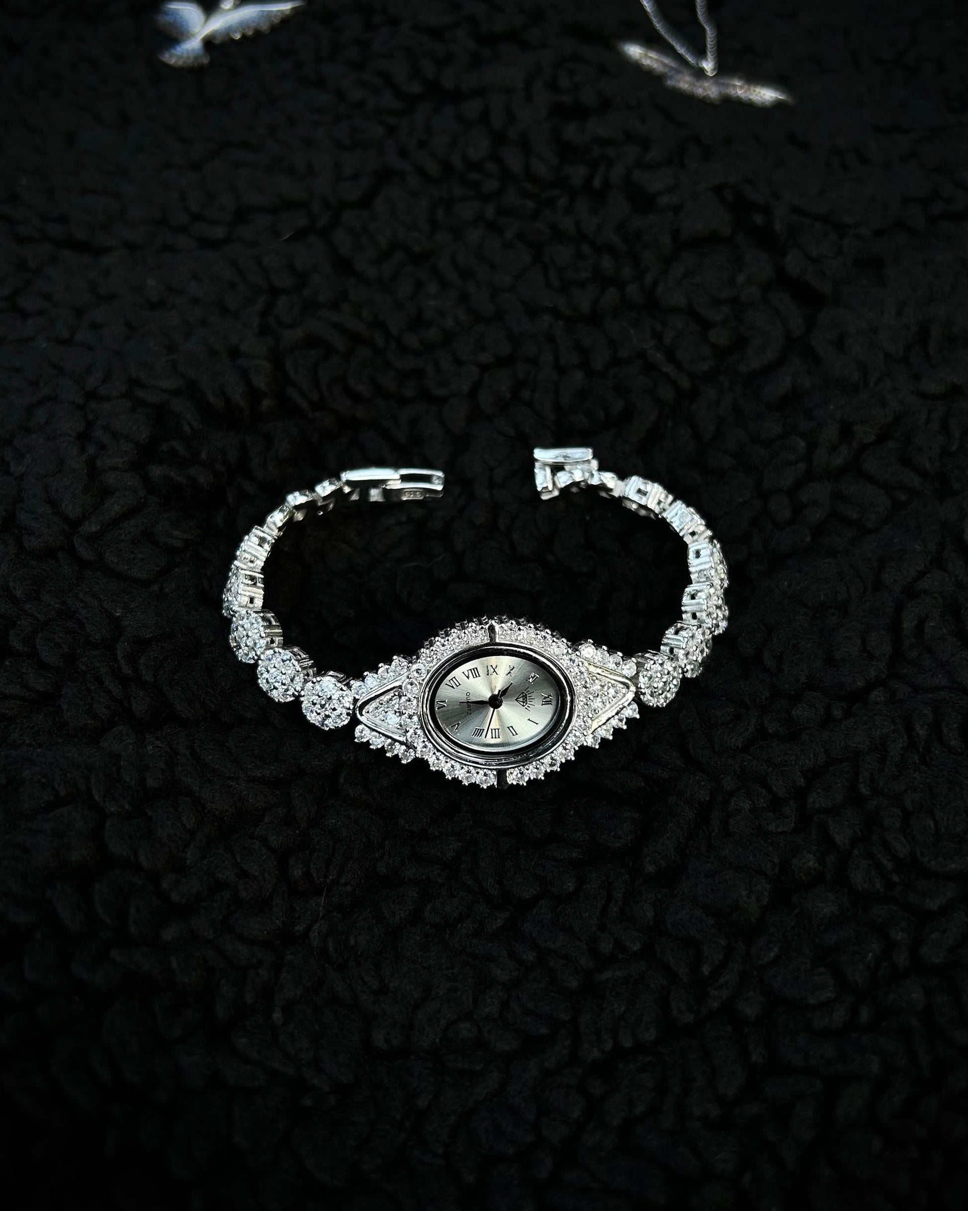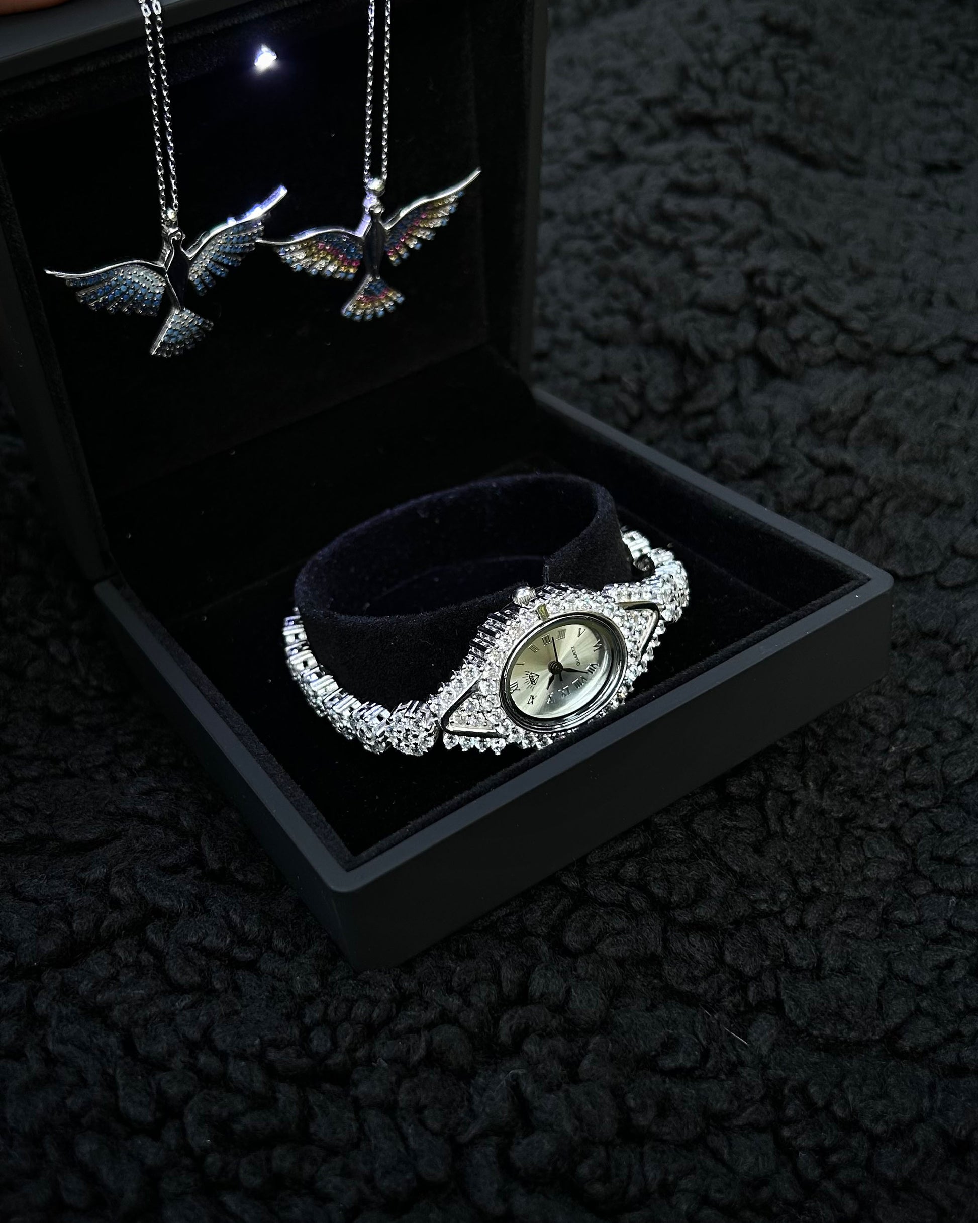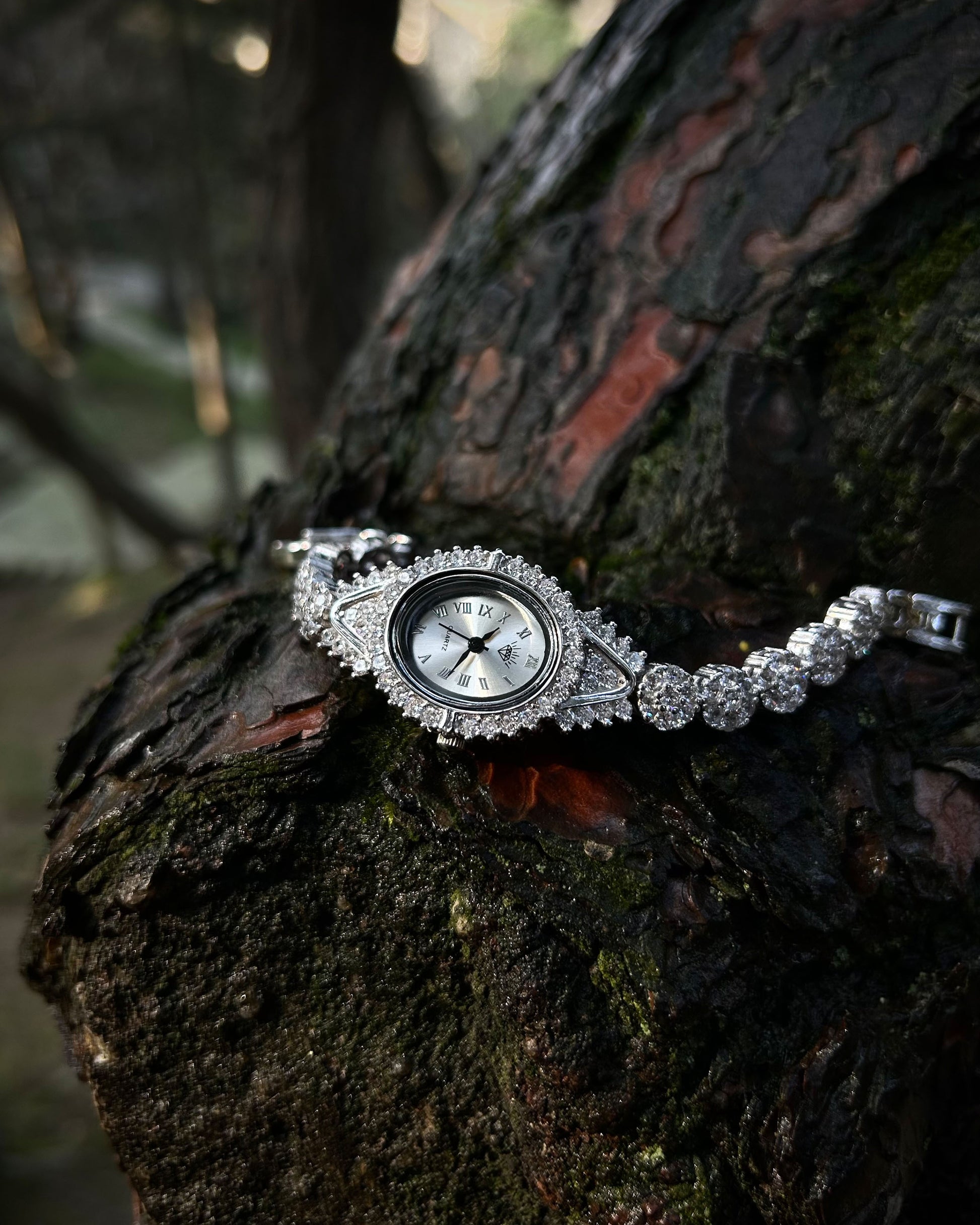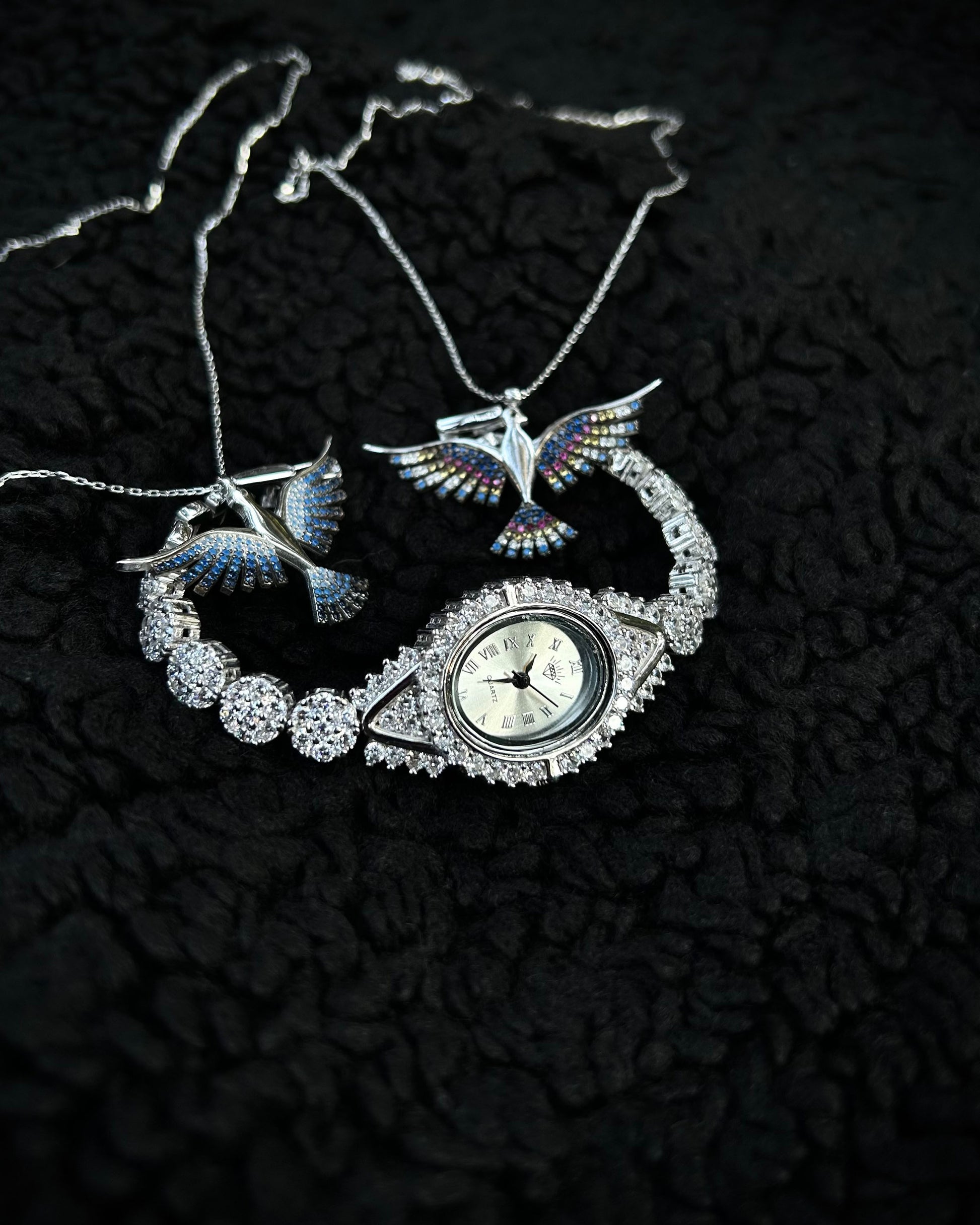 ▶ Bu saat, 925 ayar gümüşten üretilmiş ve yaklaşık 125–130 adet zirkon taşla elde süslenmiştir. Etsy üzeri satış fiyatı 20.490TL'dir