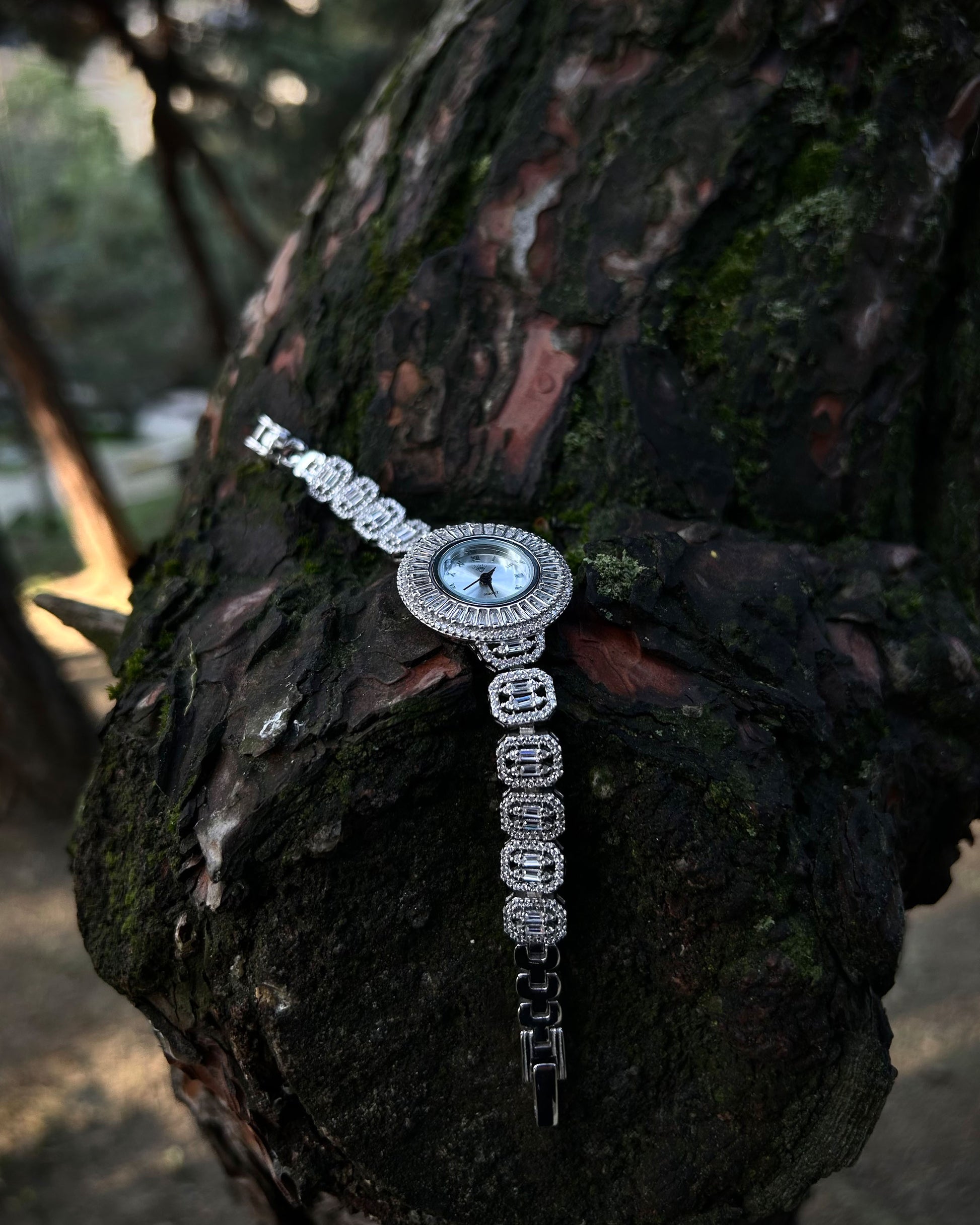 Rodyum Kaplama Taşlı Kadın Saati Model 3 - 925 Ayar Gümüş