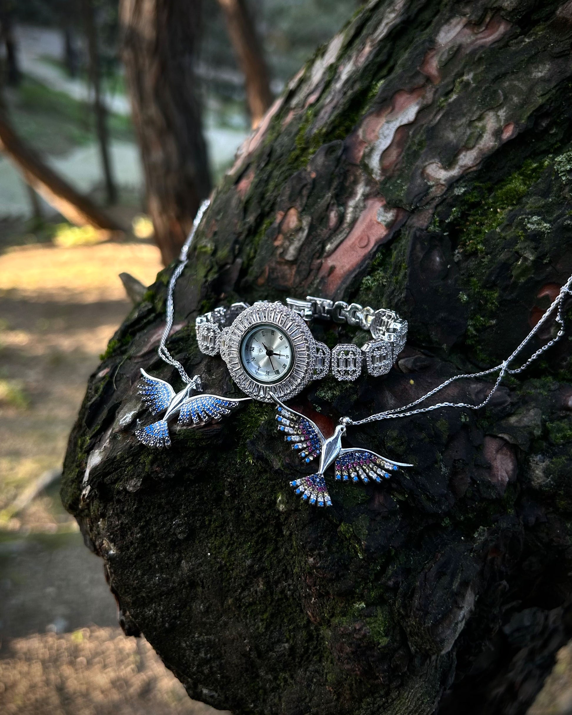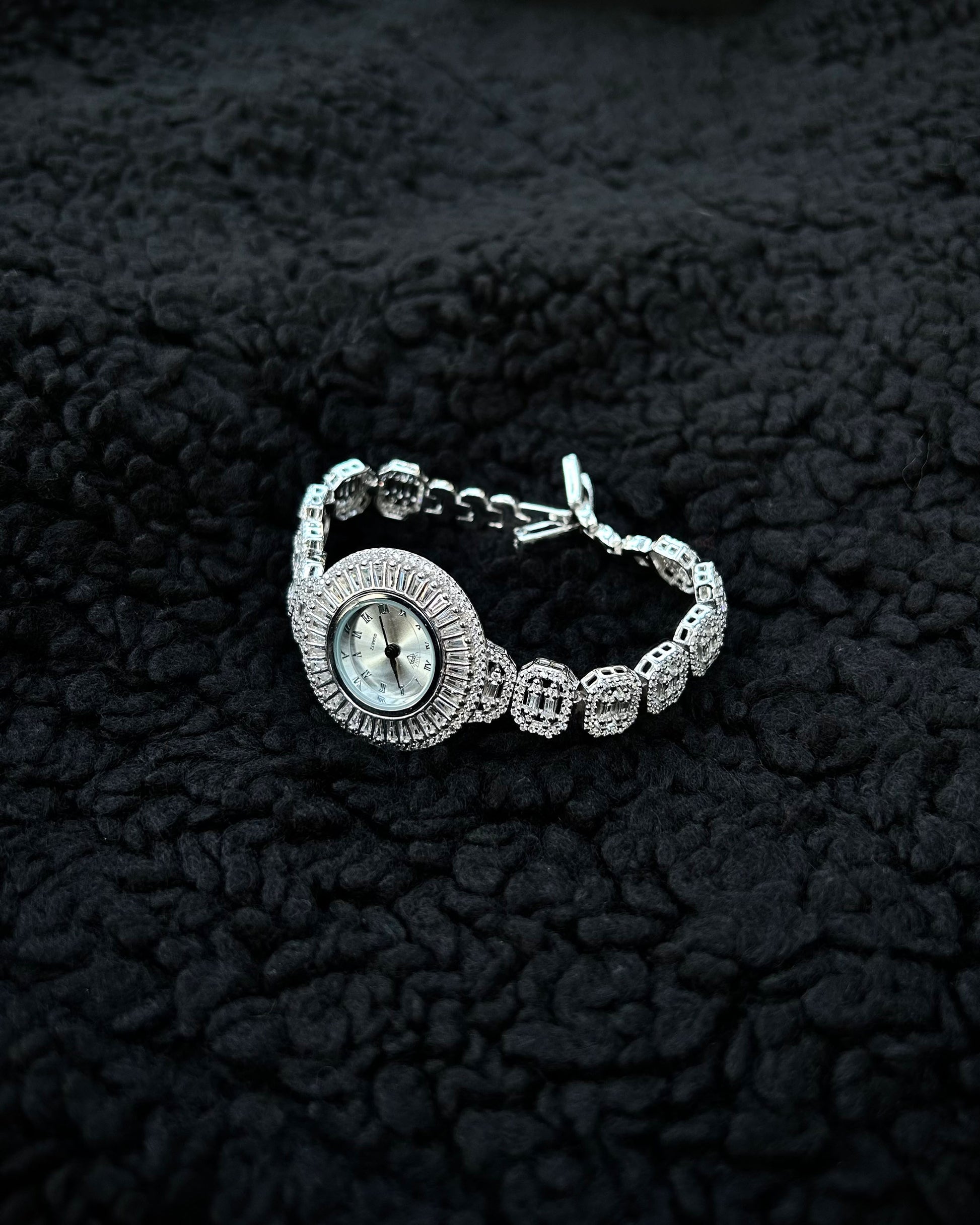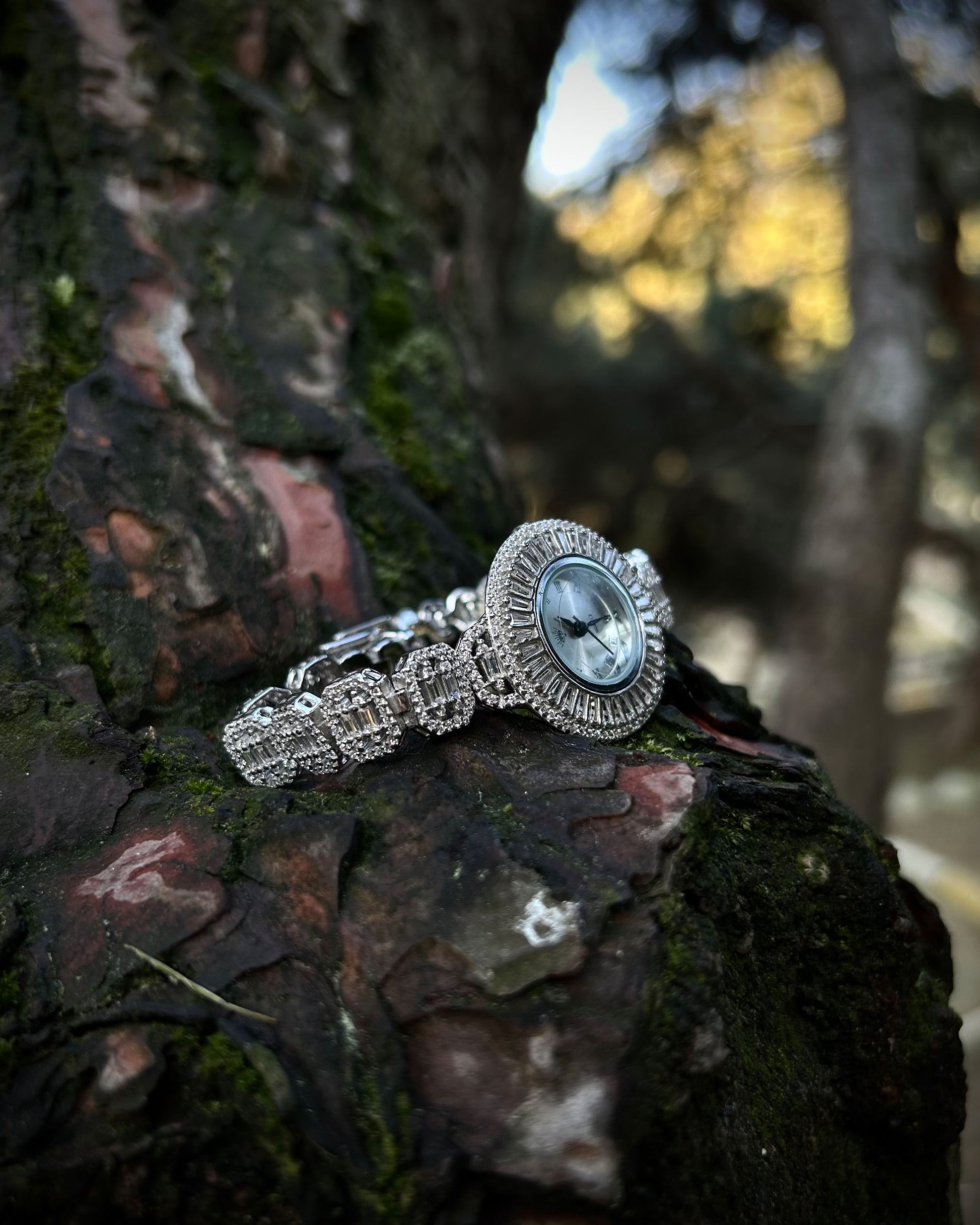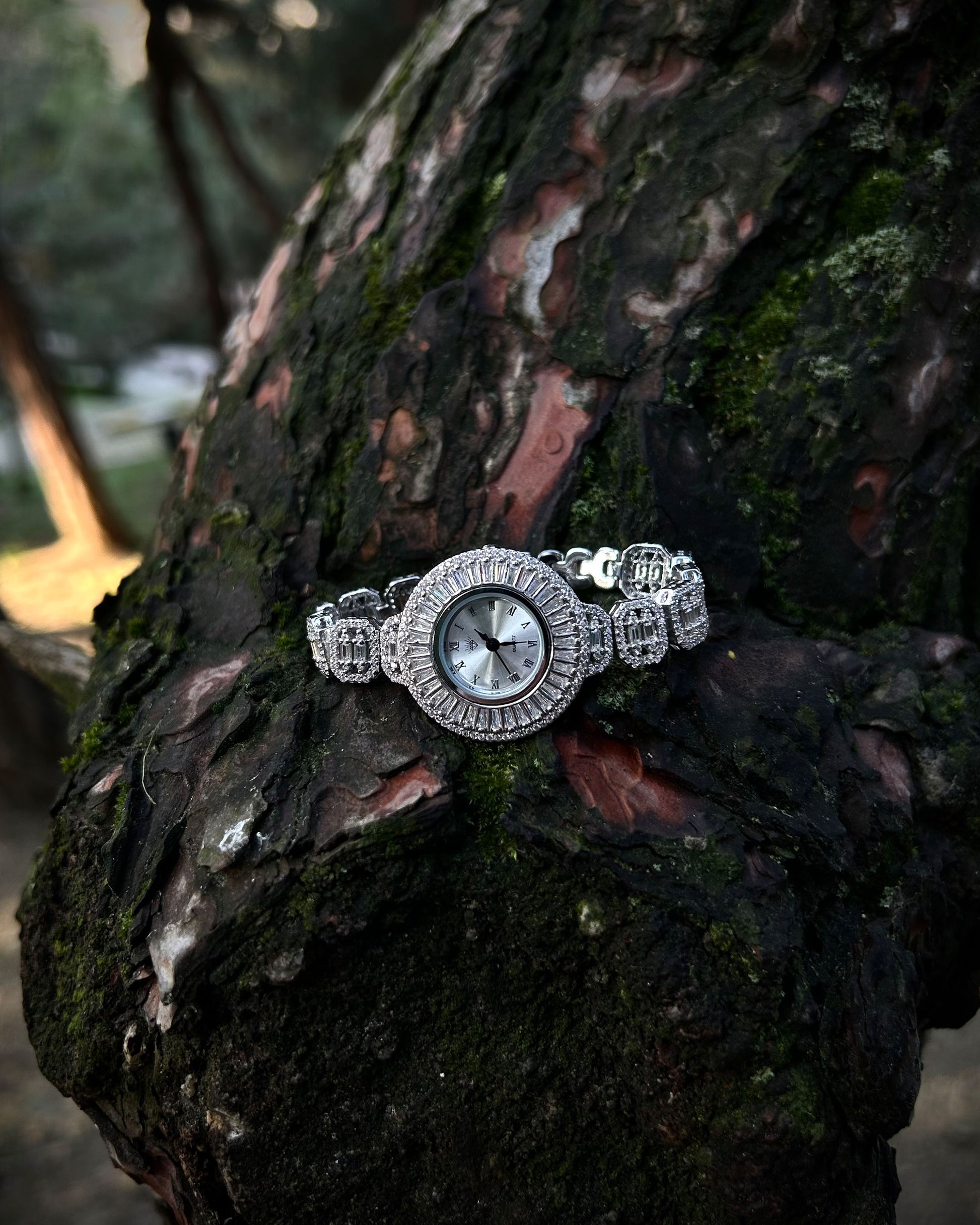 ▶ Bu saat, 925 ayar gümüşten üretilmiş ve yaklaşık 440-450 adet zirkon taşla elde süslenmiştir. Etsy üzeri satış fiyatı 20.490TL'dir