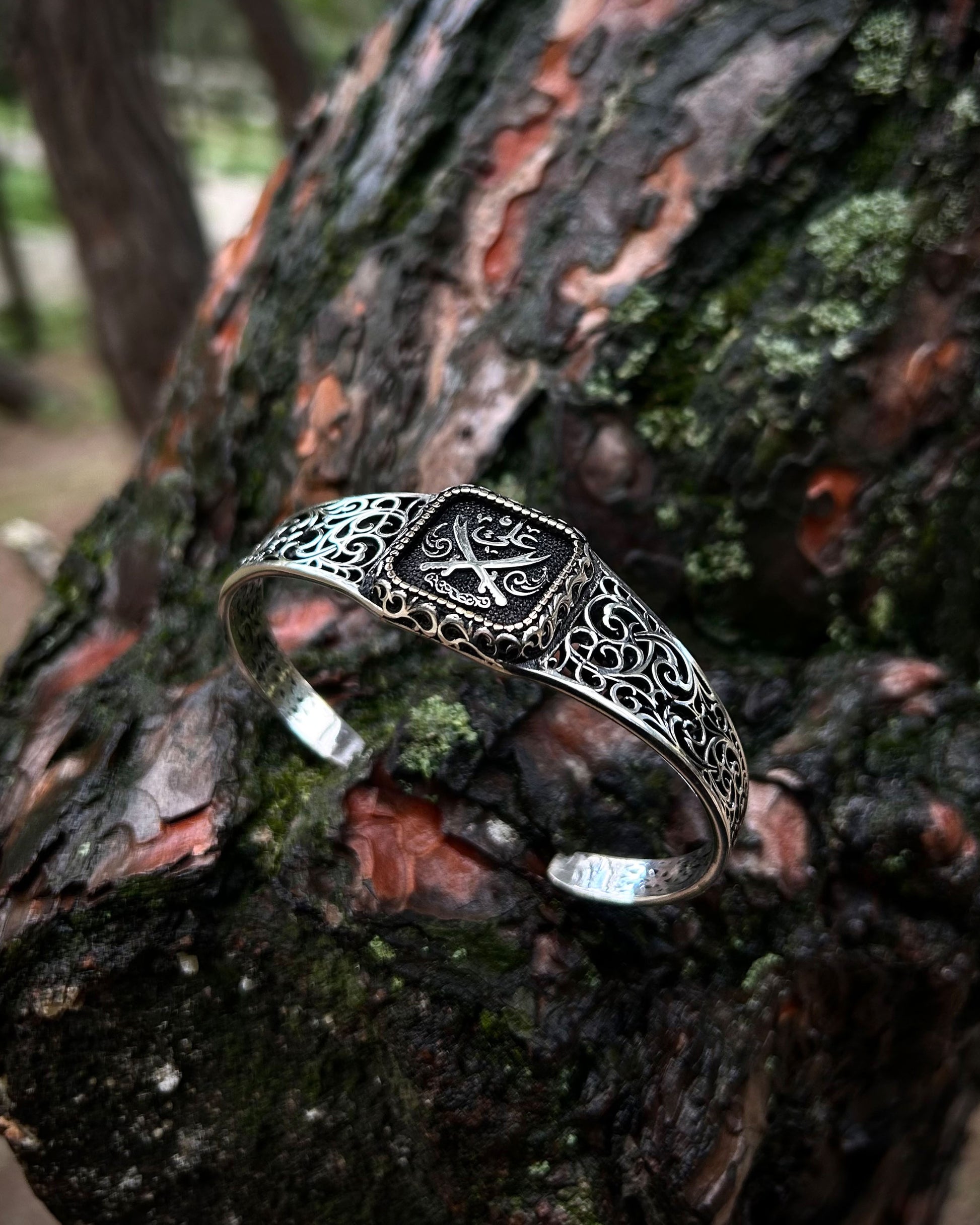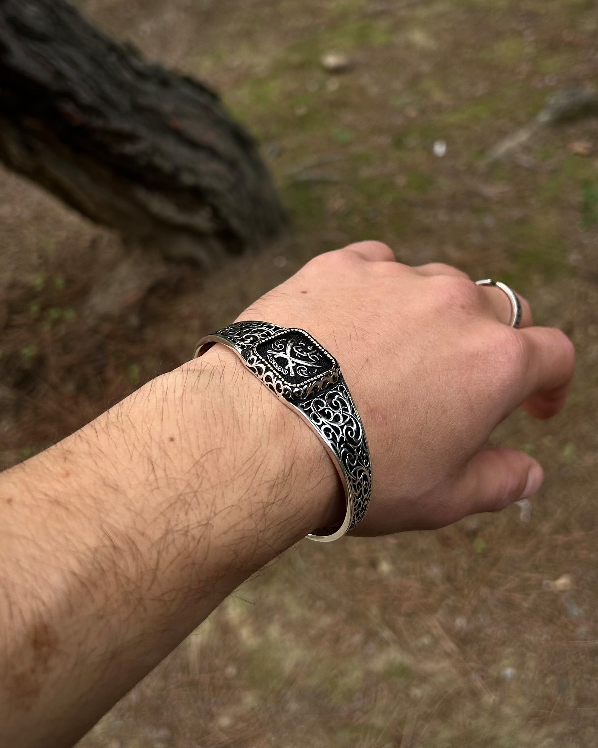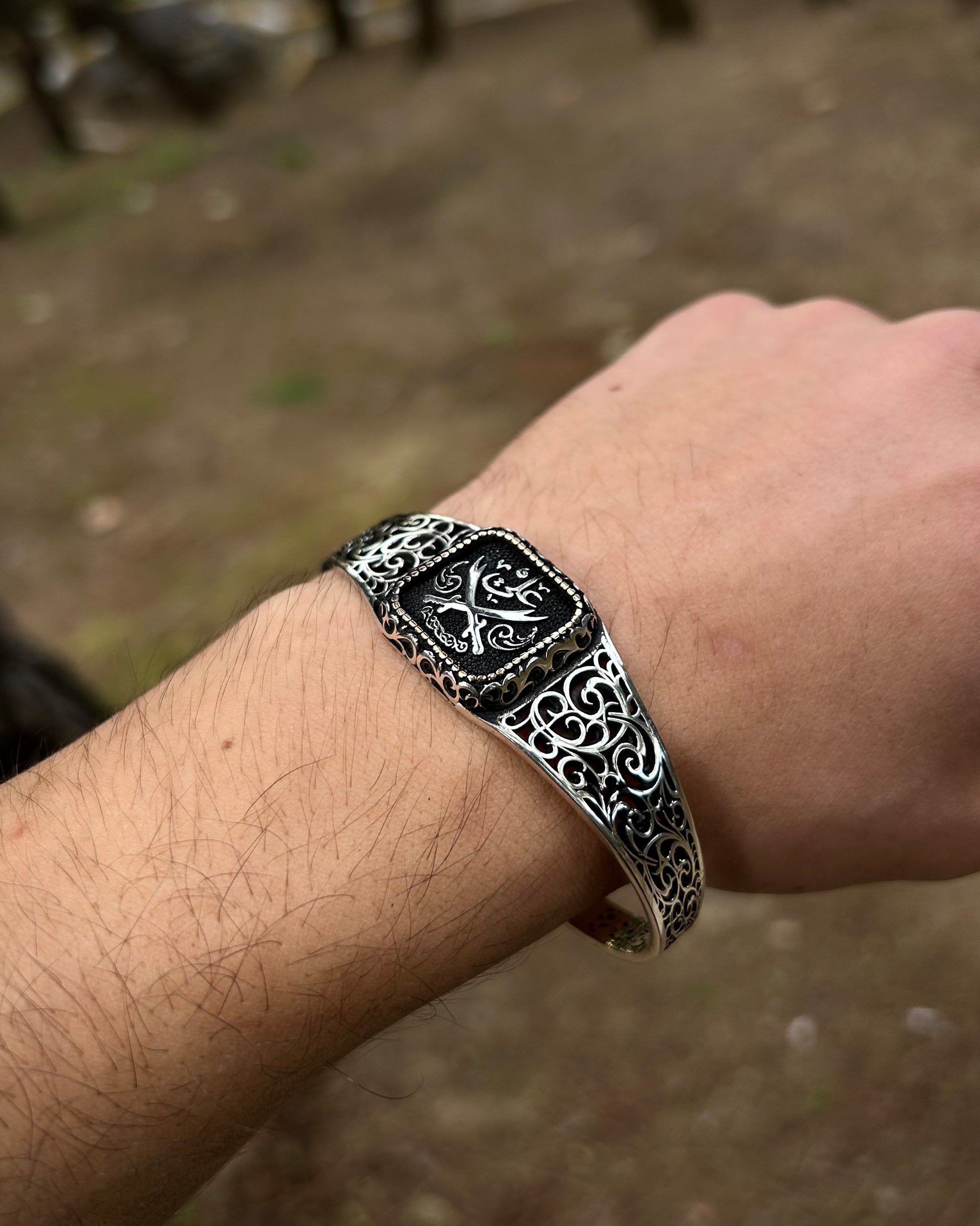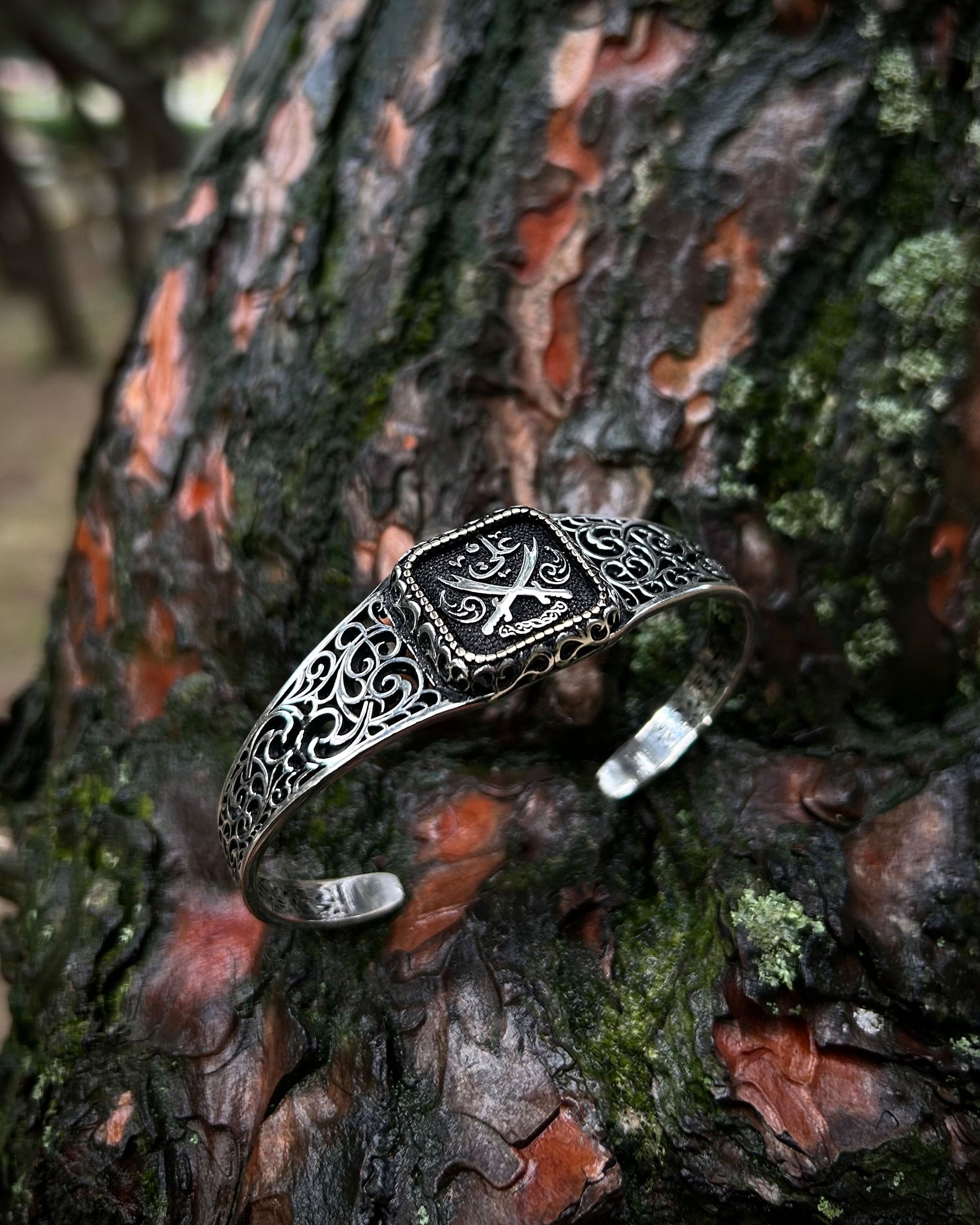 Efsanevi Zülfikar kılıçları ve "Ali" yazısı ile işlenmiş bu kelepçe bileklik, 925 ayar gümüşten üretilmiş manevi bir İslami tılsımdır. Gücü ve sembolizmi bir araya getirir; hem inanca hem de estetiğe hitap eder.