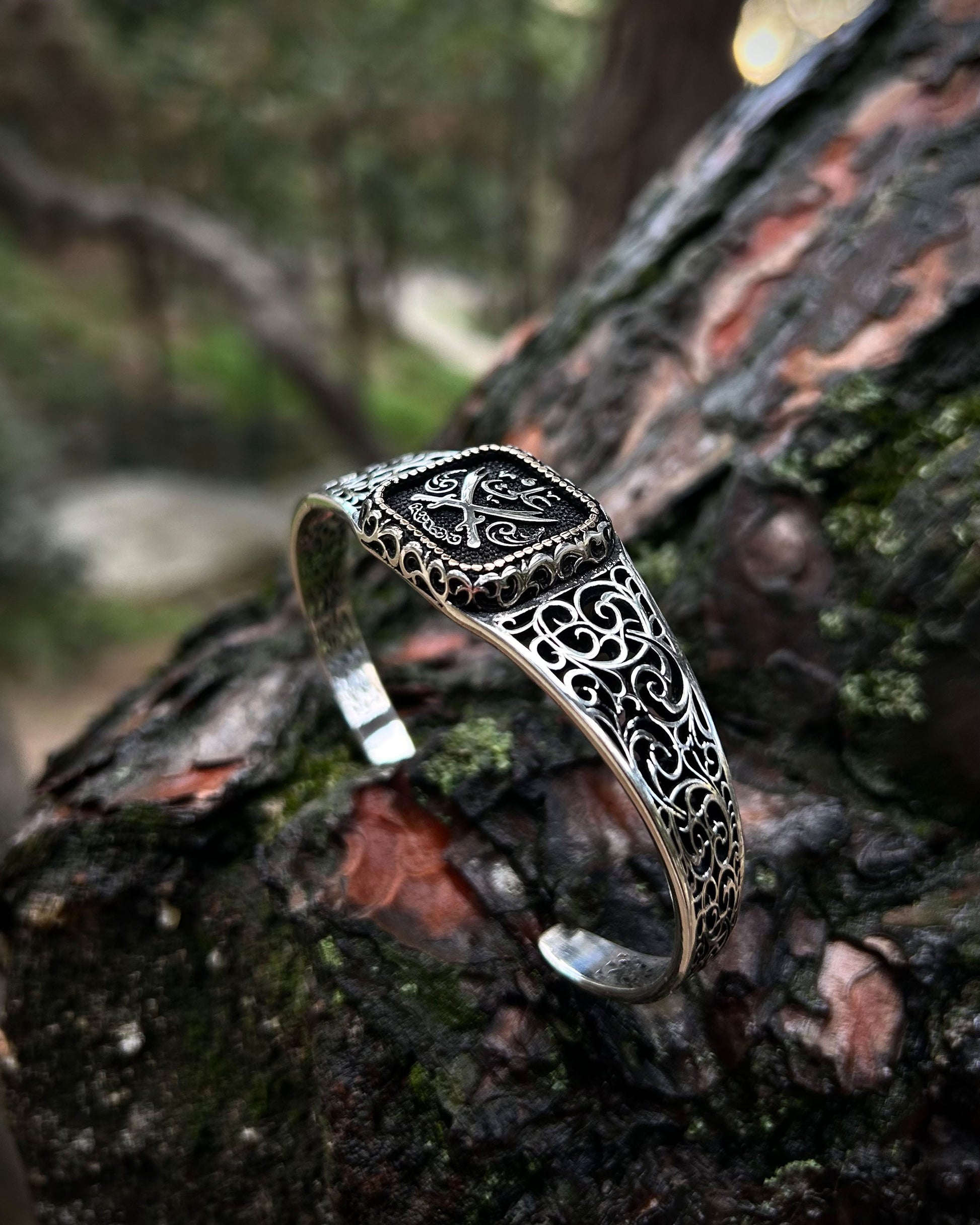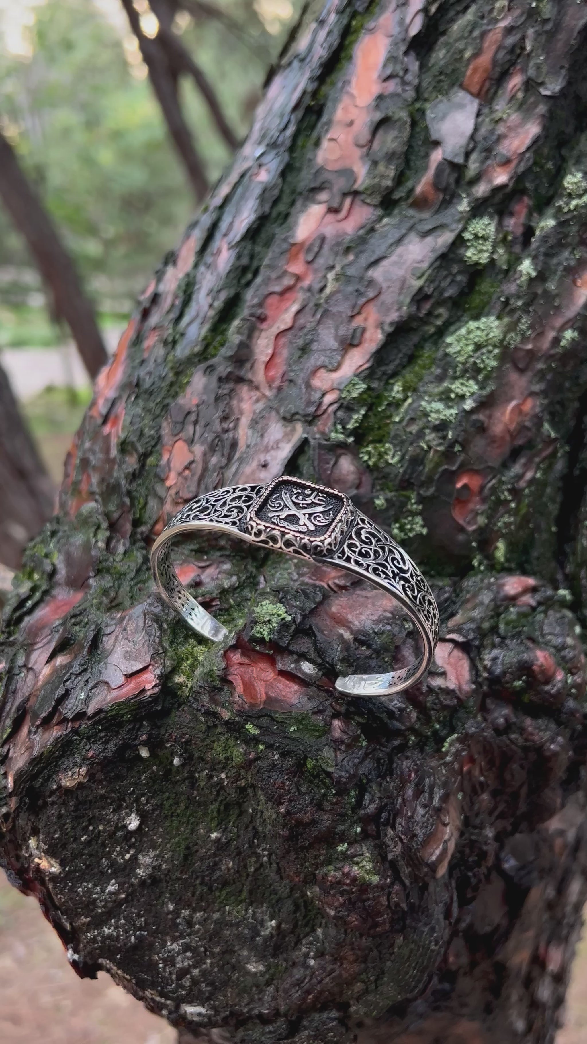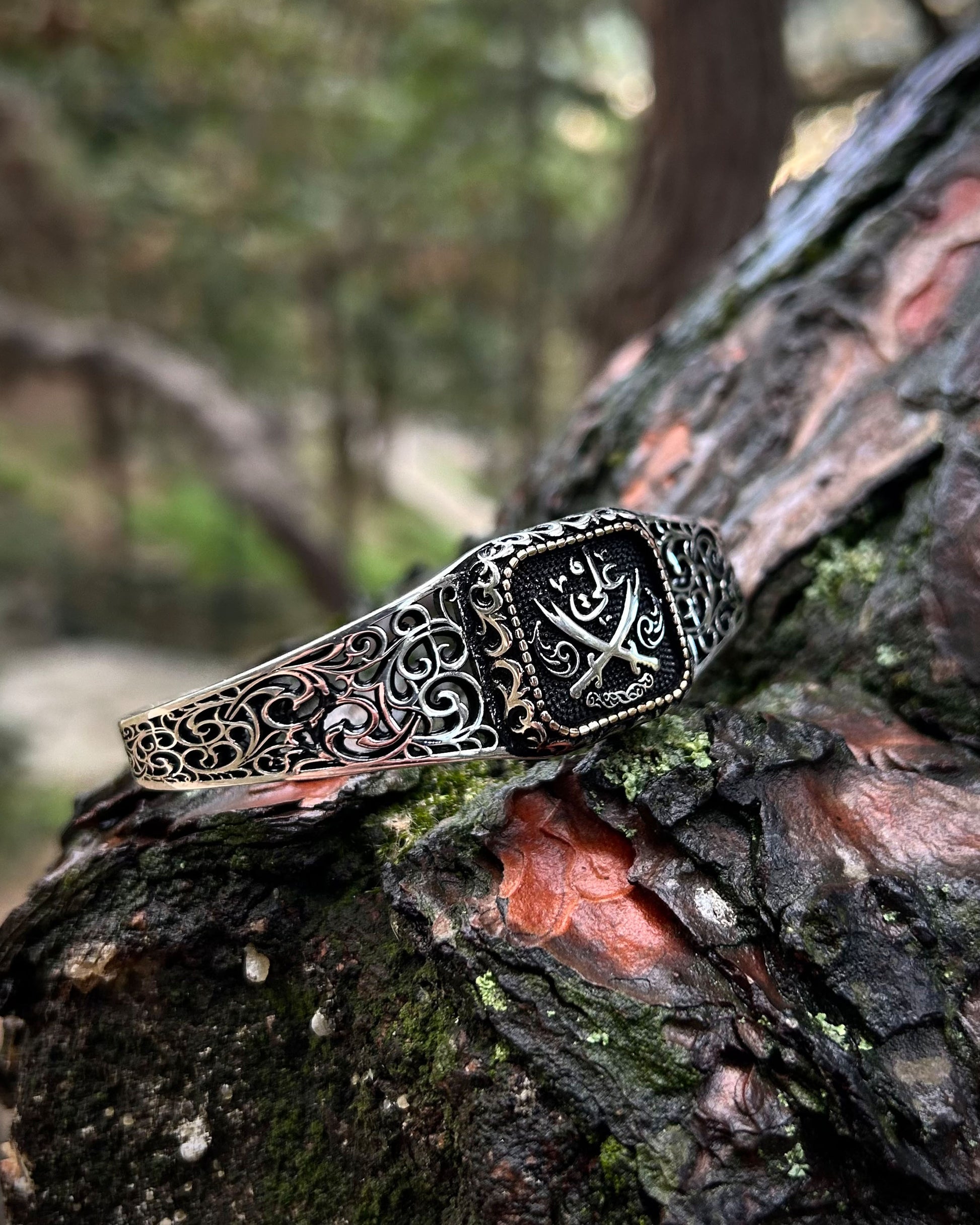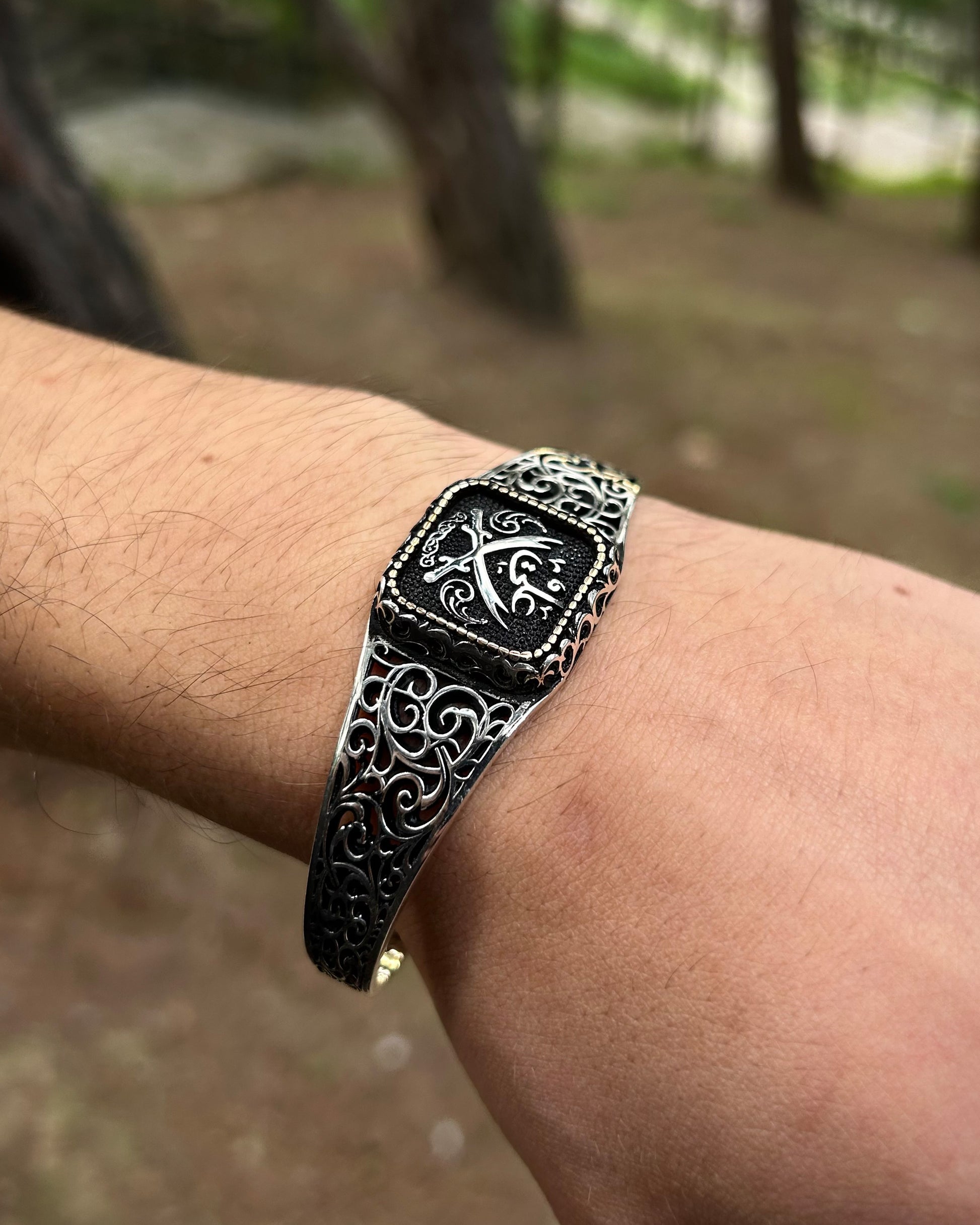 Efsanevi Zülfikar kılıçları ve "Ali" yazısı ile işlenmiş bu kelepçe bileklik, 925 ayar gümüşten üretilmiş manevi bir İslami tılsımdır. Gücü ve sembolizmi bir araya getirir; hem inanca hem de estetiğe hitap eder.