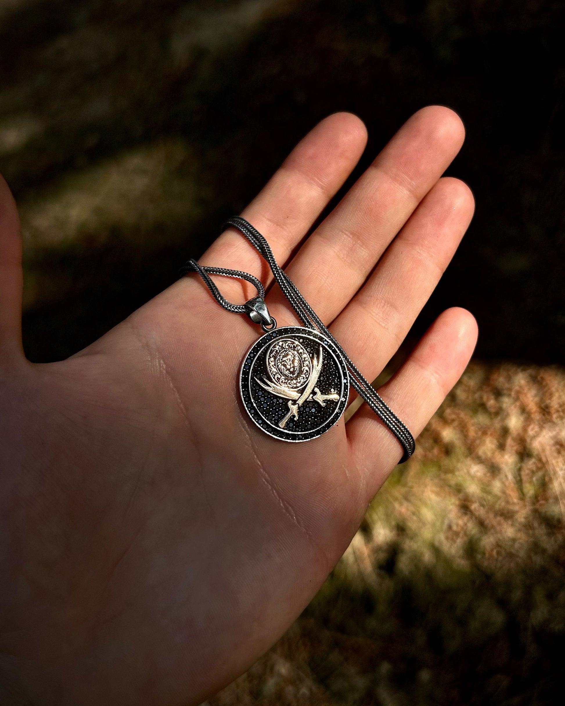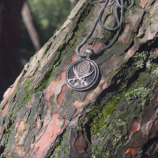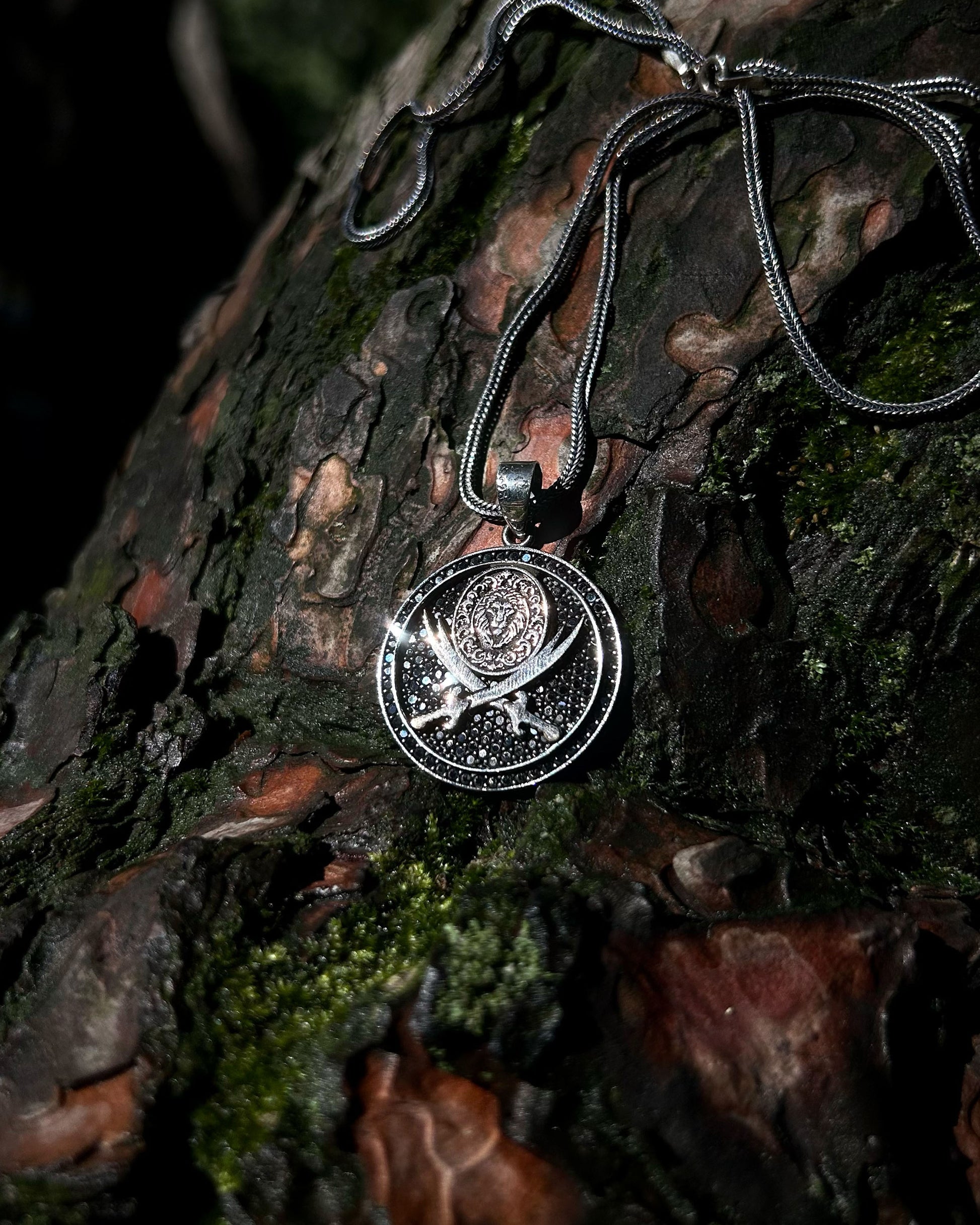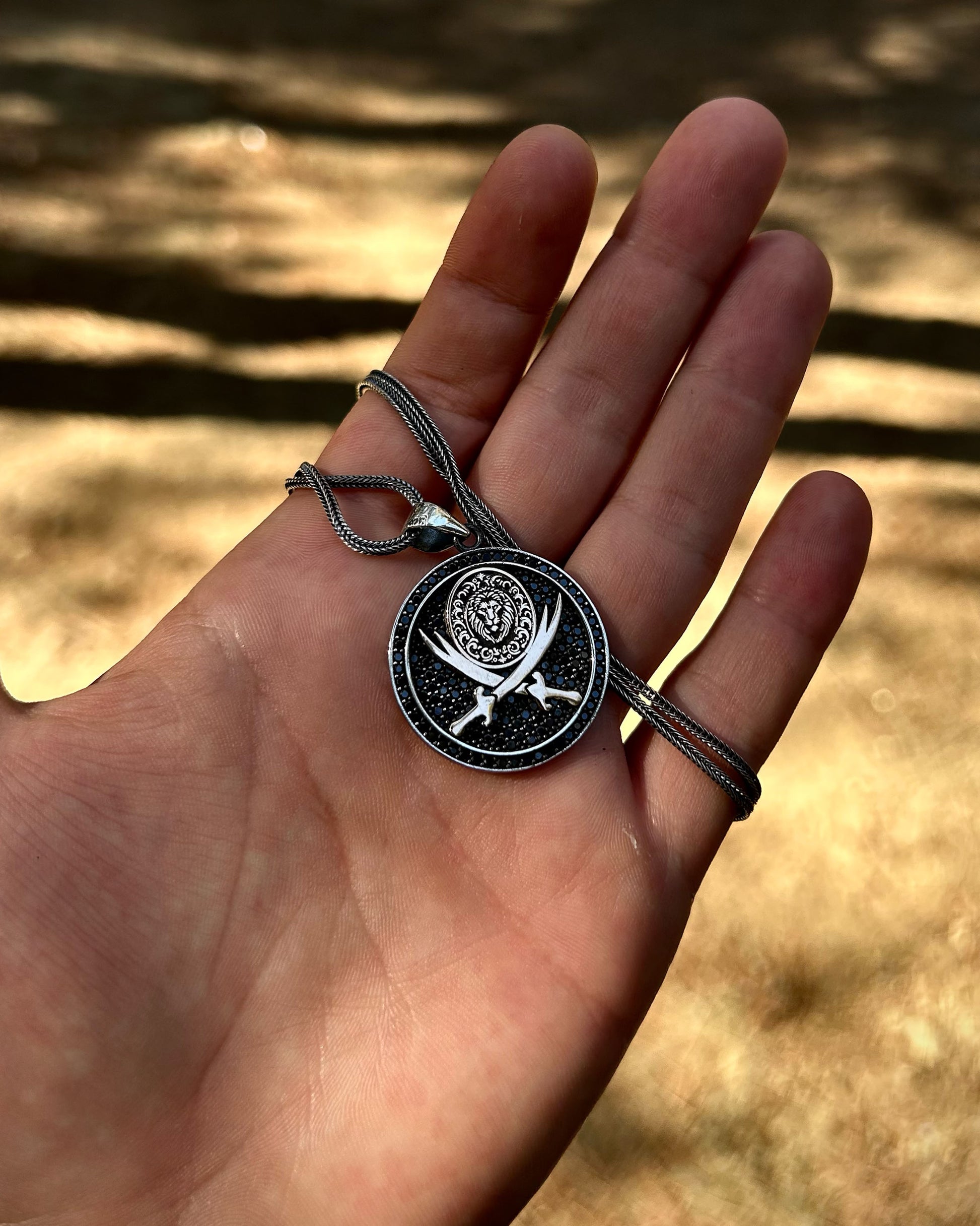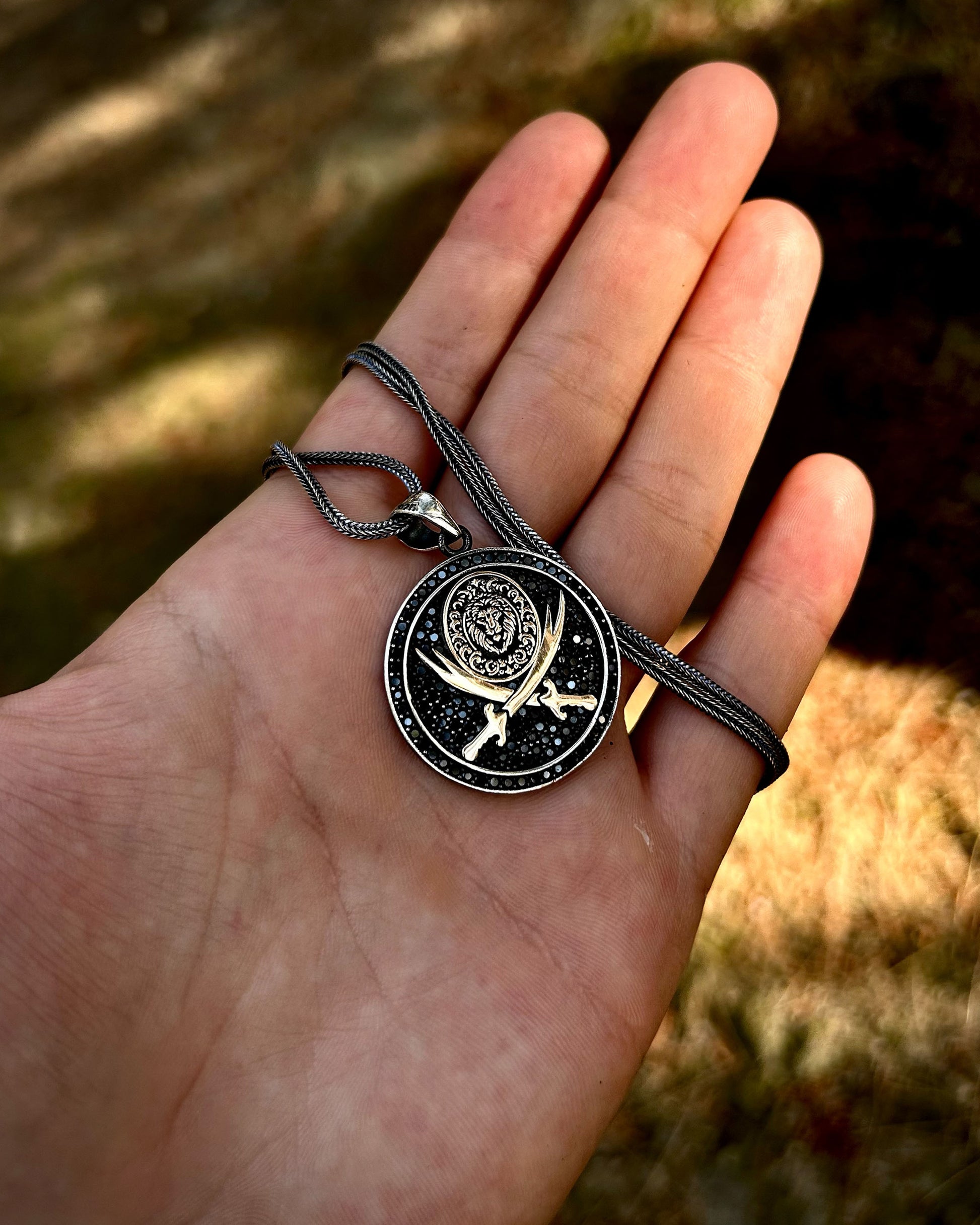 Bu özel tasarım kolye, Hz. Ali’nin Zülfikar kılıcını ve “Allah’ın Aslanı” unvanını simgeler. Aslan başı figürü ve Zülfikar silueti, hem cesareti hem de ilahi adaleti bir araya getirir.